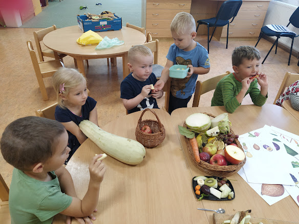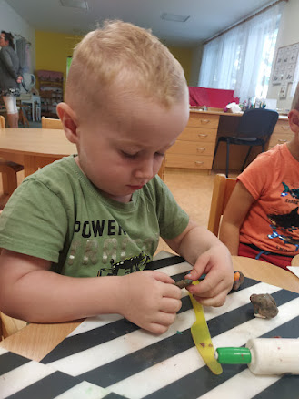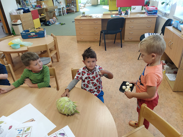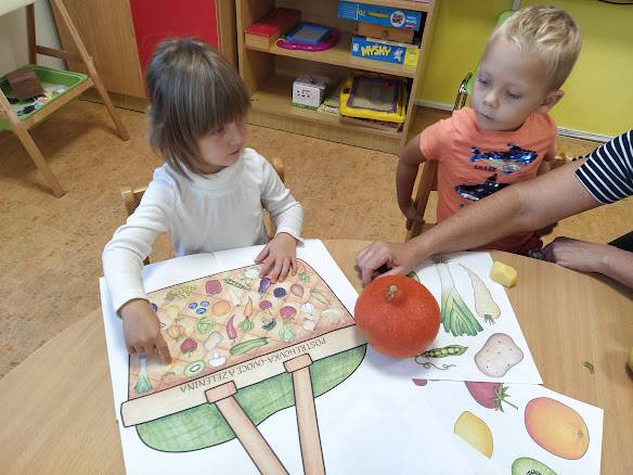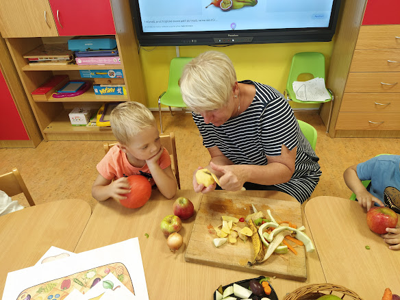 Děti si přinesly z domova své ovoce a zeleninu. Společně jsme si všichni povídali o rozdílech mezi oběma druhy. Zároveň děti ochutnaly od každého jednotlivého druhu. Nakonec všichni vymodelovali své ovoce na misce.