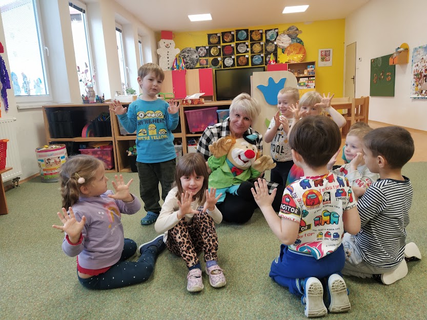 ŠAŠEK DĚLÁ LEGRACI, MÁ TO PŘECE NA PRÁCI. ROZHAZUJE RUKAMA, VYKOPÁVÁ NOHAMA. ZADEČKEM SI ZAVRTÍ A PAK MÁVÁ NA DĚTI. ŠIROCE SE USMĚJE, HEZKÝ DEN TI POPŘEJE.