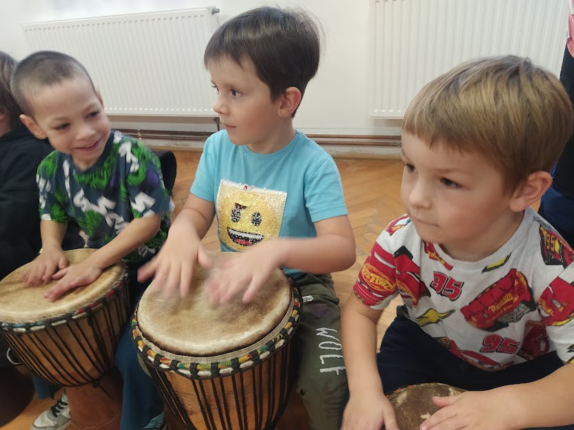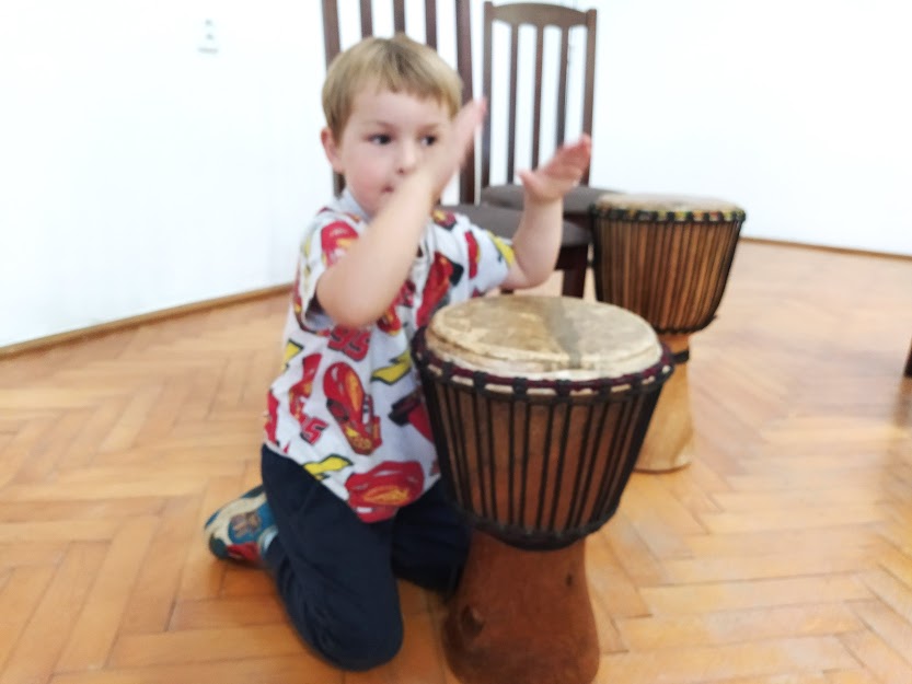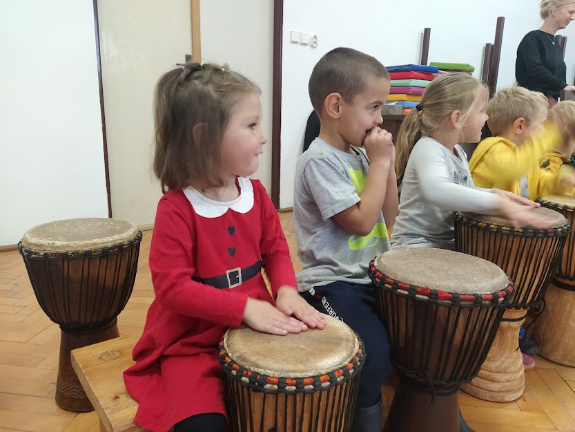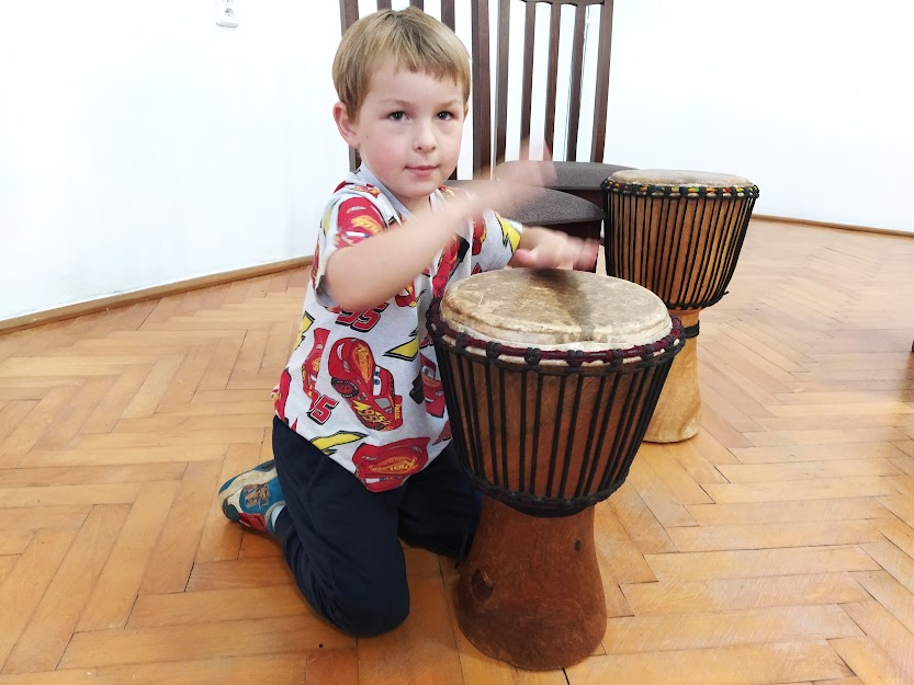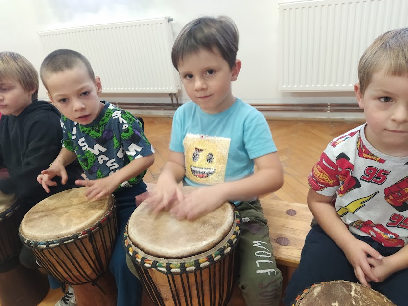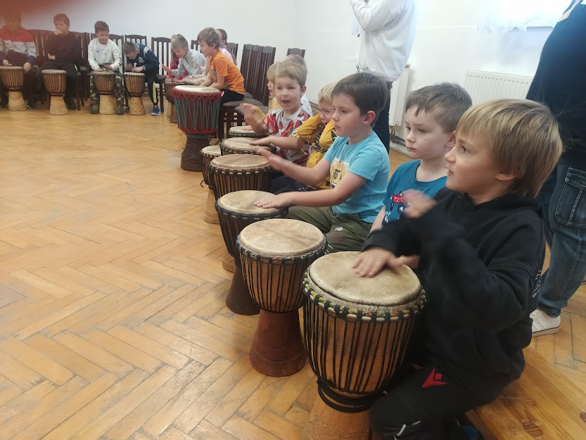 DĚTI SE NAUČILY ZÁKLADNÍ RYTMY NA HRU NA DJEMBE. (MYŠKA,MEDVĚD,HAD..)