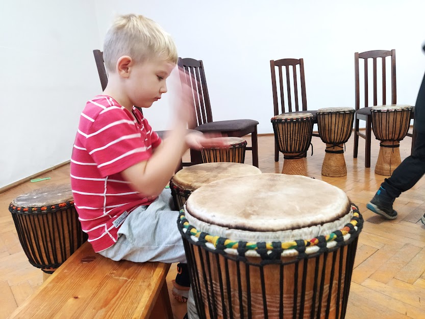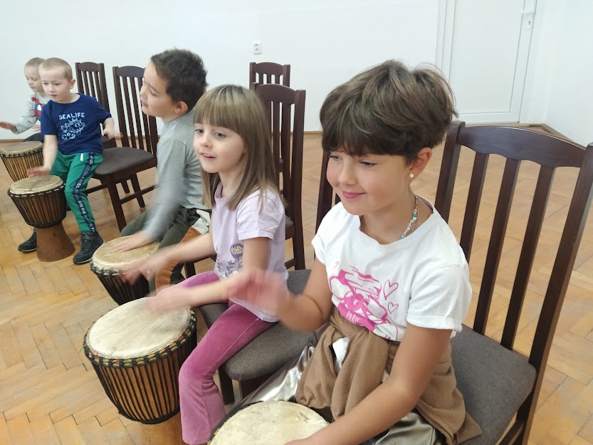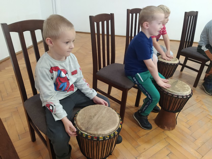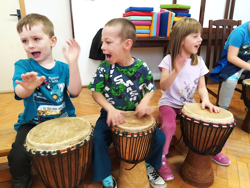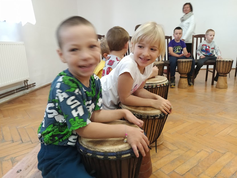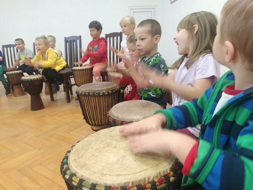 DĚTI SE NAUČILY ZÁKLADNÍ RYTMY NA HRU NA DJEMBE. (MYŠKA,MEDVĚD,HAD..)