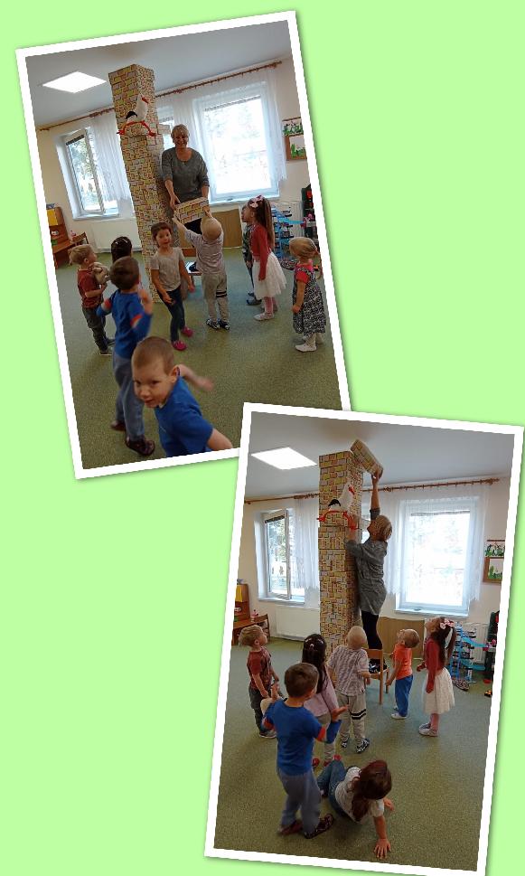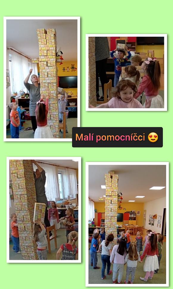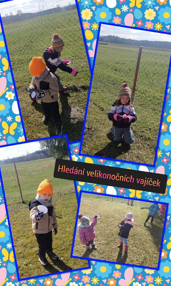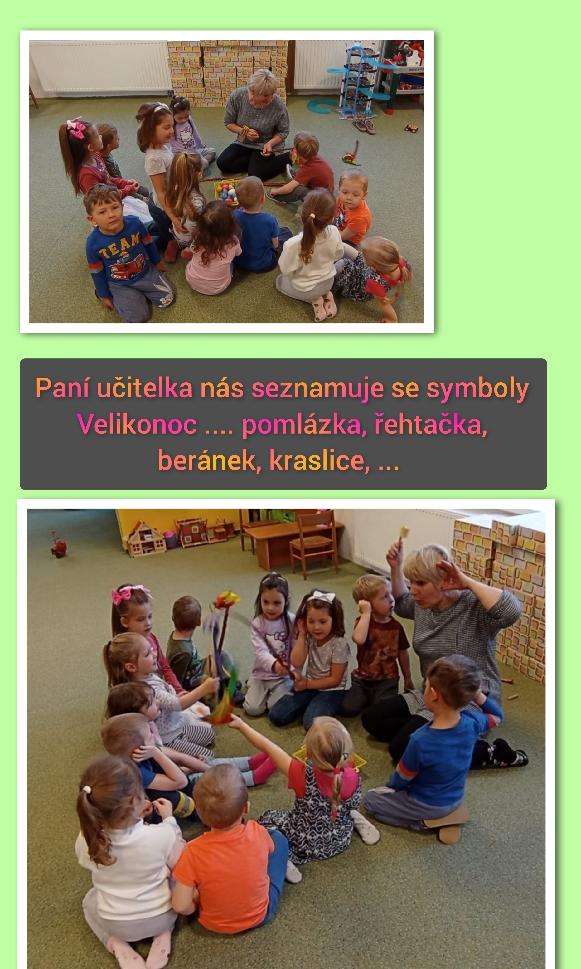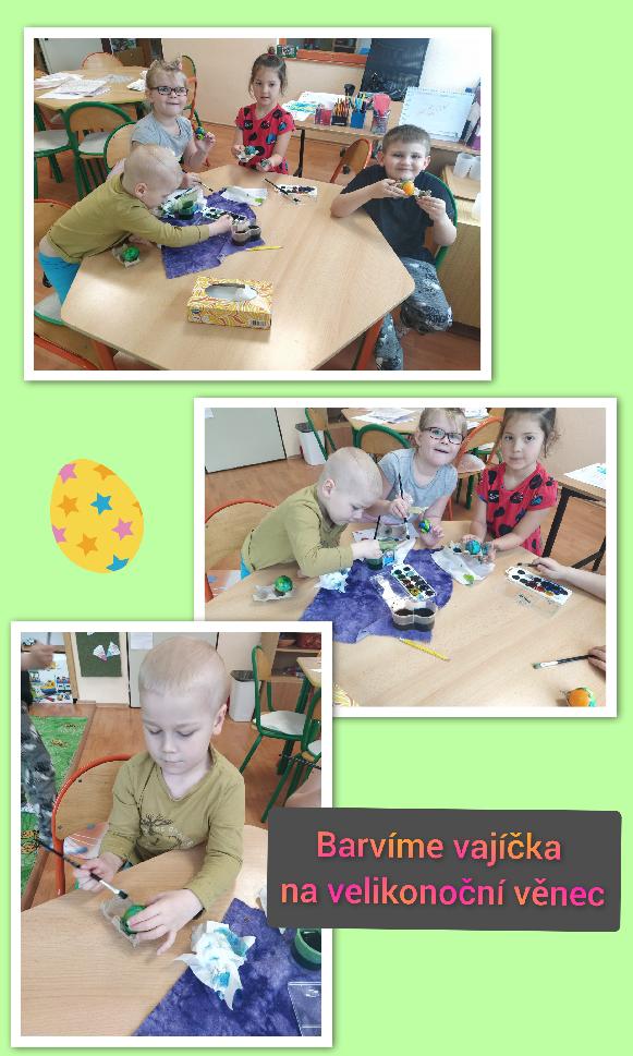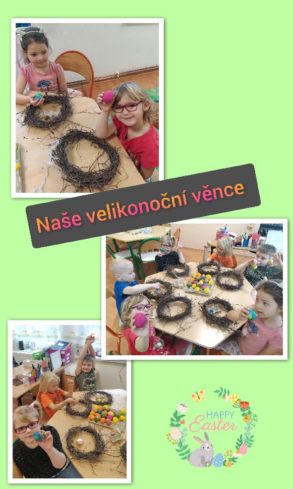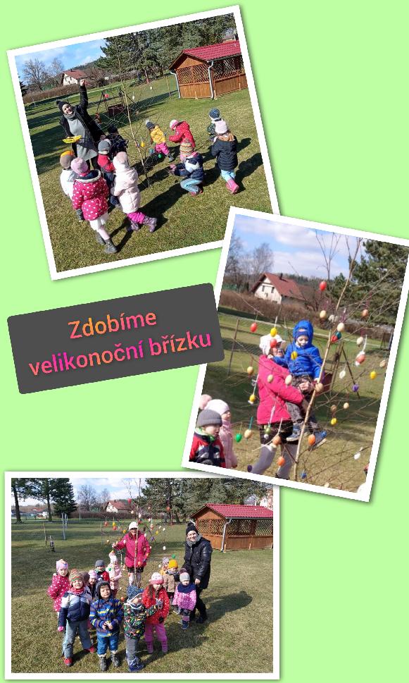 Ale ani děti z MŠ nezahálely. Předškoláčci například mimo jiné tvořili věnce z větviček a vajíček, mladší děti nás při tradičním setkání dětí z MŠ a ZŠ při společném muzicírování překvapily krásnými jarními básničkami a nejednou velikonoční říkankou. Nechybělo ani tradiční hledání velikonočních vajíček a nakonec si děti za pomoci paní učitelky postavily veliký komín, aby k nim mohl zavítat jeden z poslů jara – pan ČÁP.